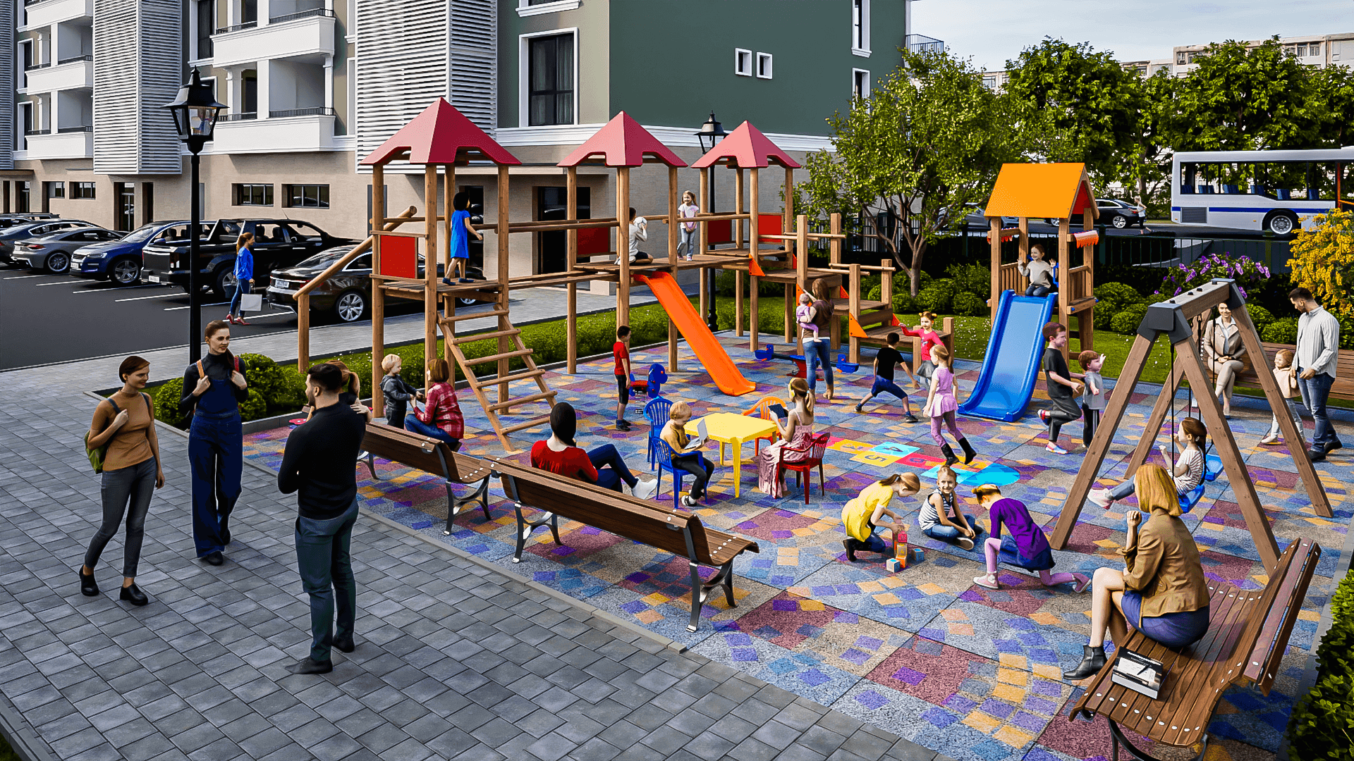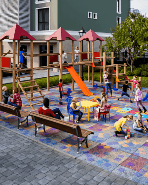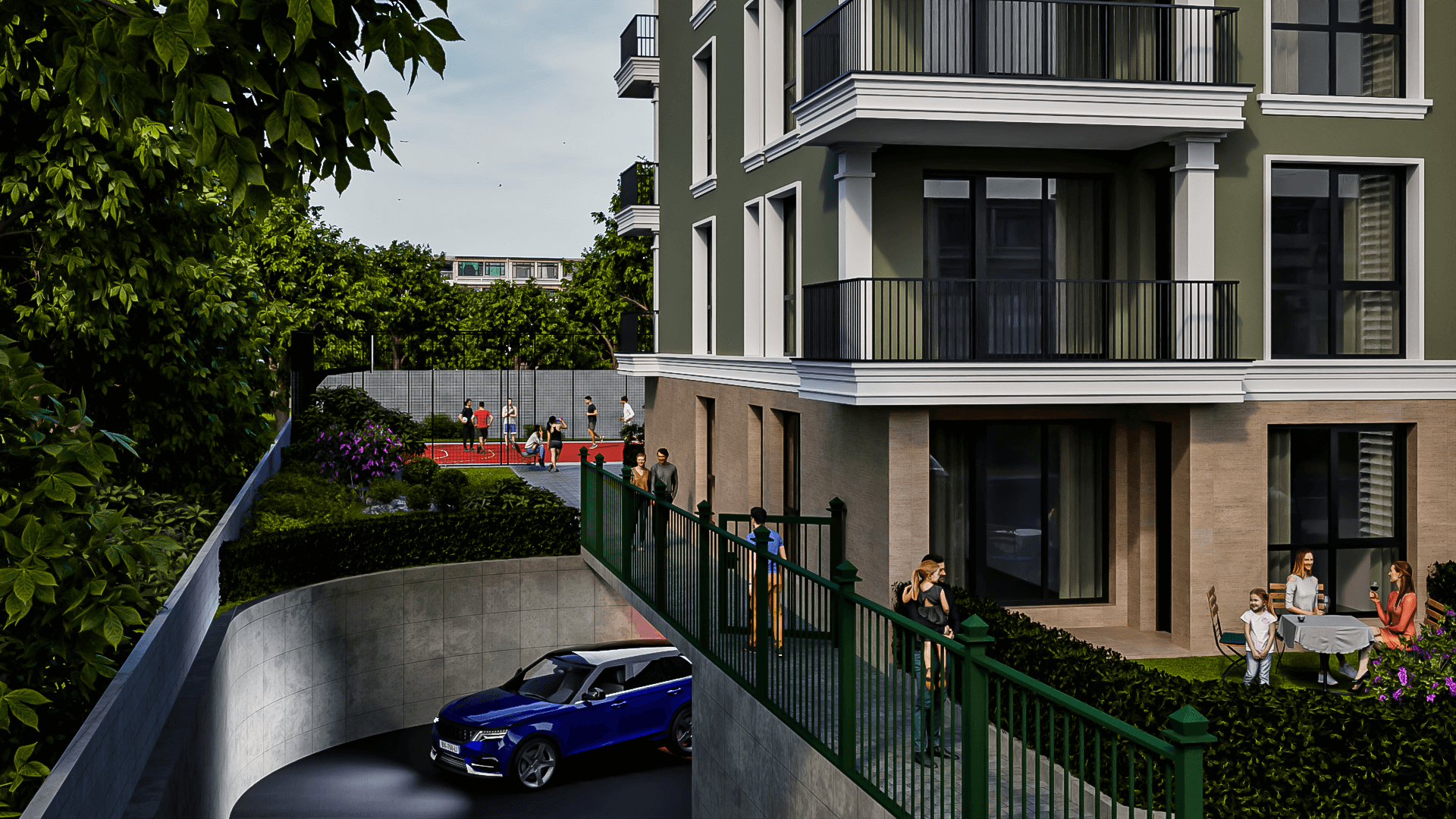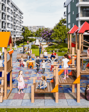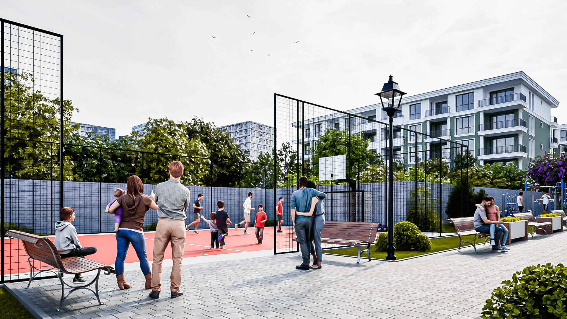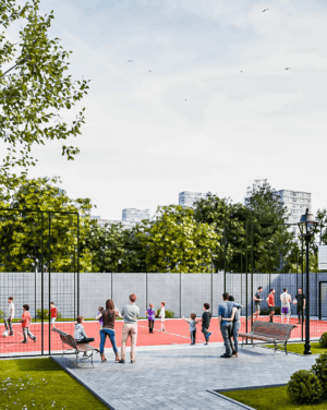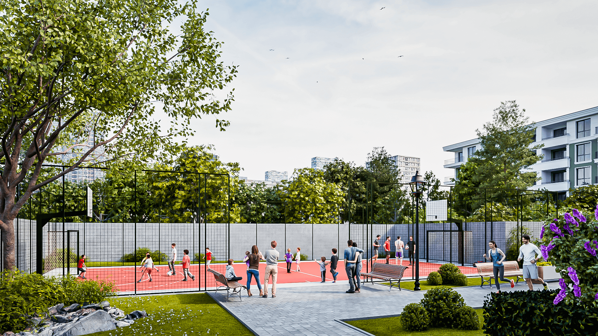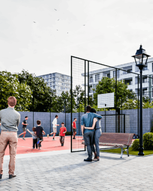 - Пространства за игра и социализация – футболно и баскетболно игрище. Вече не е нужно да палите колата, за да заведете детето в парка, той е в комплекса, в контролирана и защитена среда.