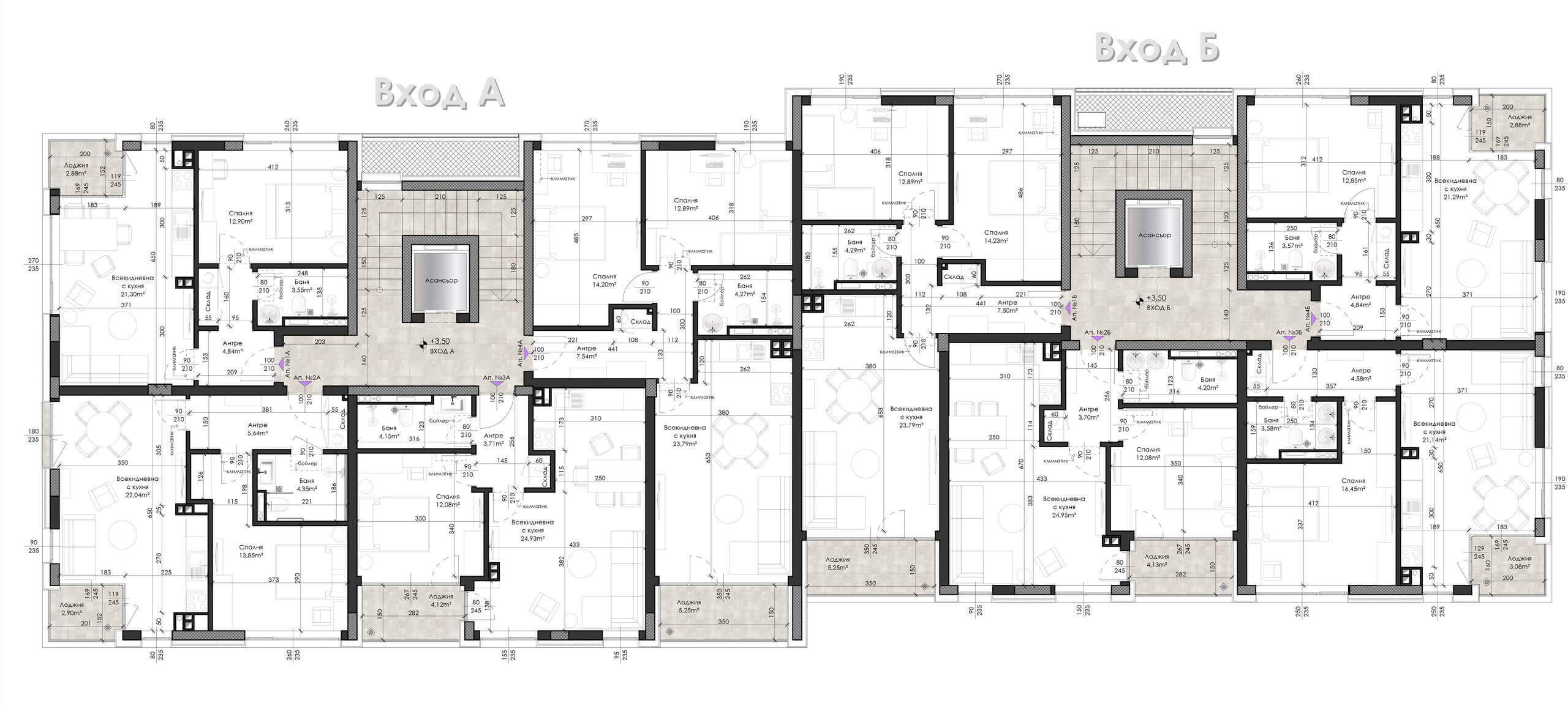 Апартамент- Дневна с кухненски бокс, 2 спални, баня с тоалетна, склад, антре и лоджия.