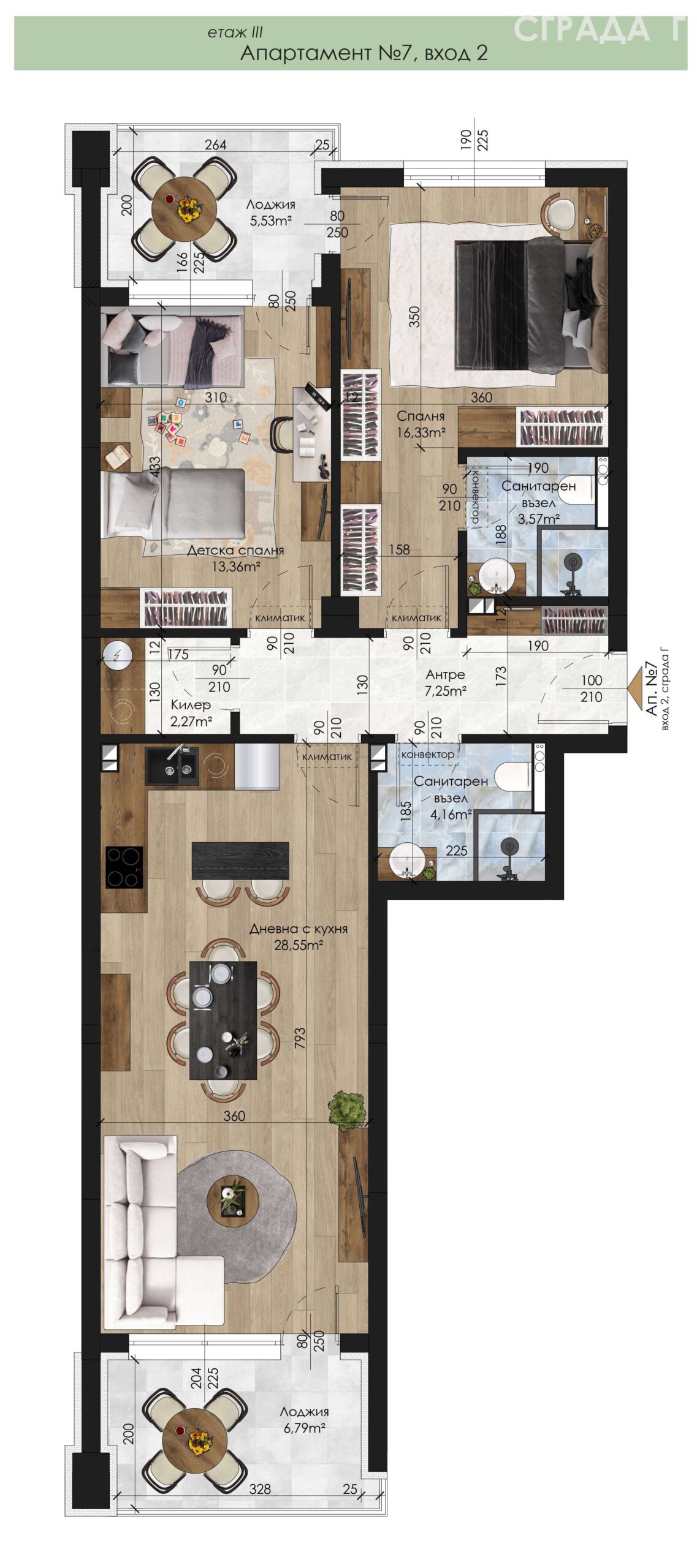 Апартамент – дневна с кухненски бокс, 2 спални, 2 санитарни възела, килер, антре и 2 лоджии.