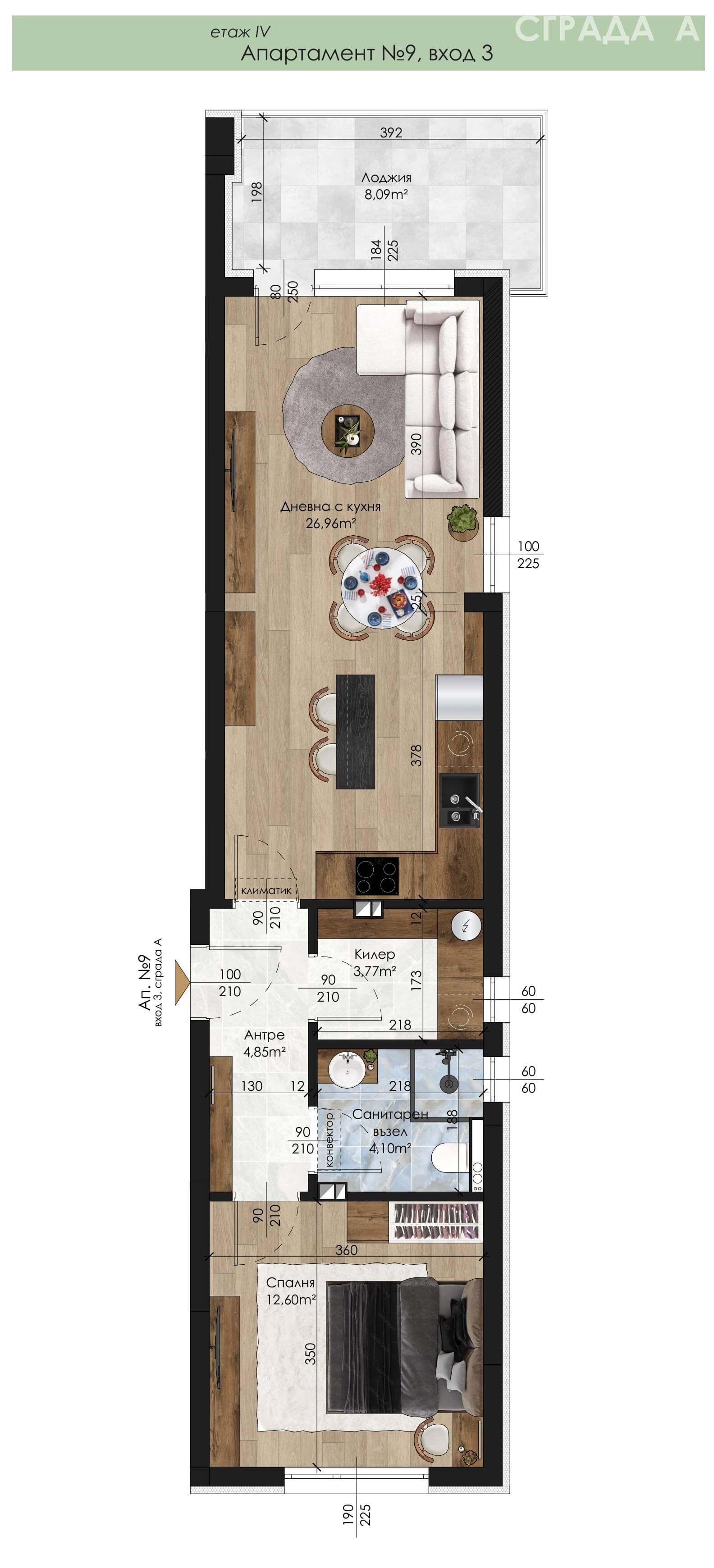 Апартамент – дневна с кухненски бокс, спалня, санитарен възел, килер, антре и лоджия.