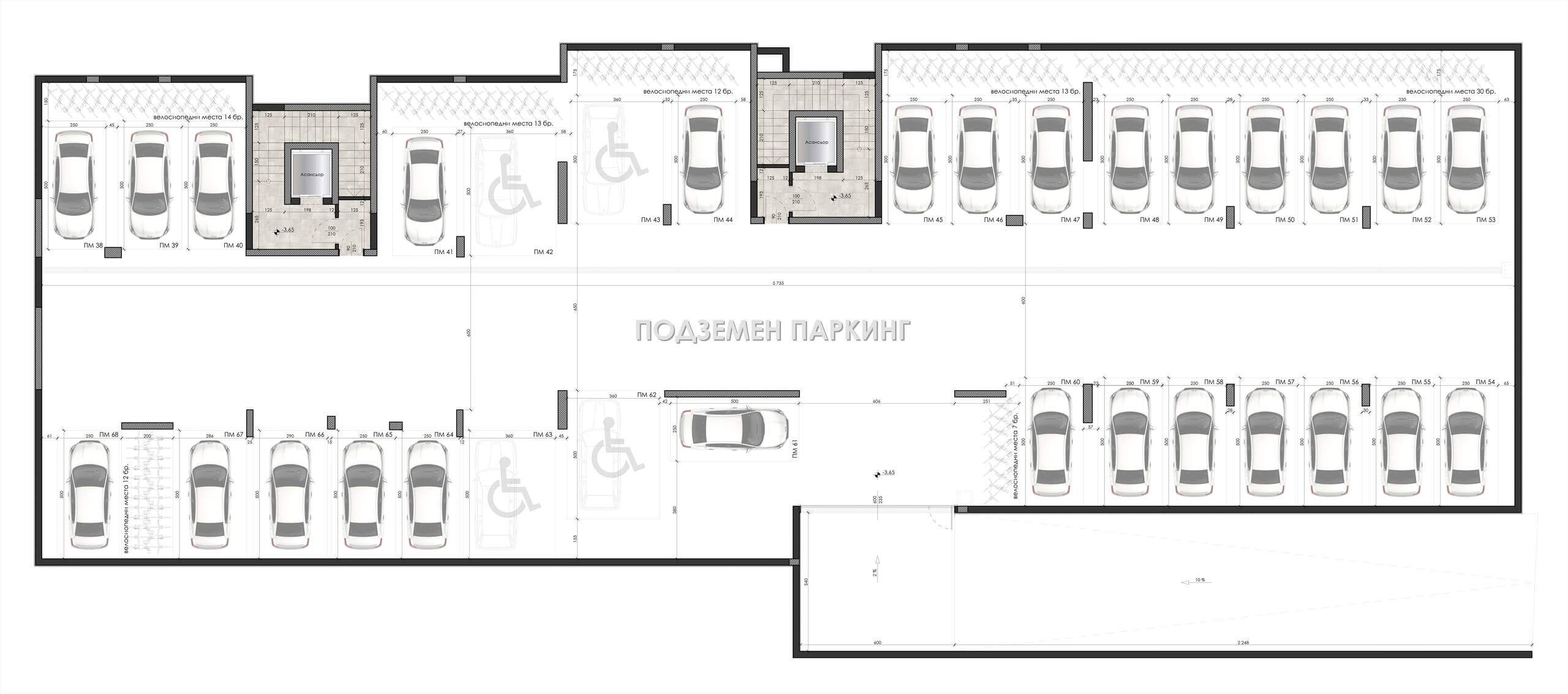 Подземно паркомясто с обща площ 18 кв.м, в която се включва 18 кв.м чиста площ, и 24,50 кв.м маневрена площ.